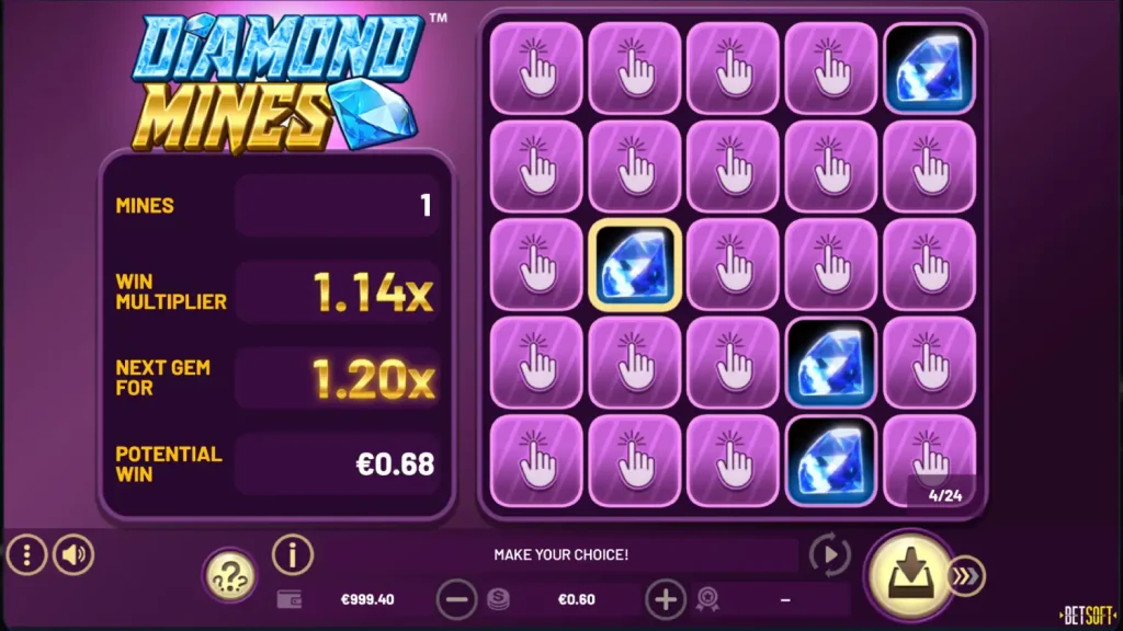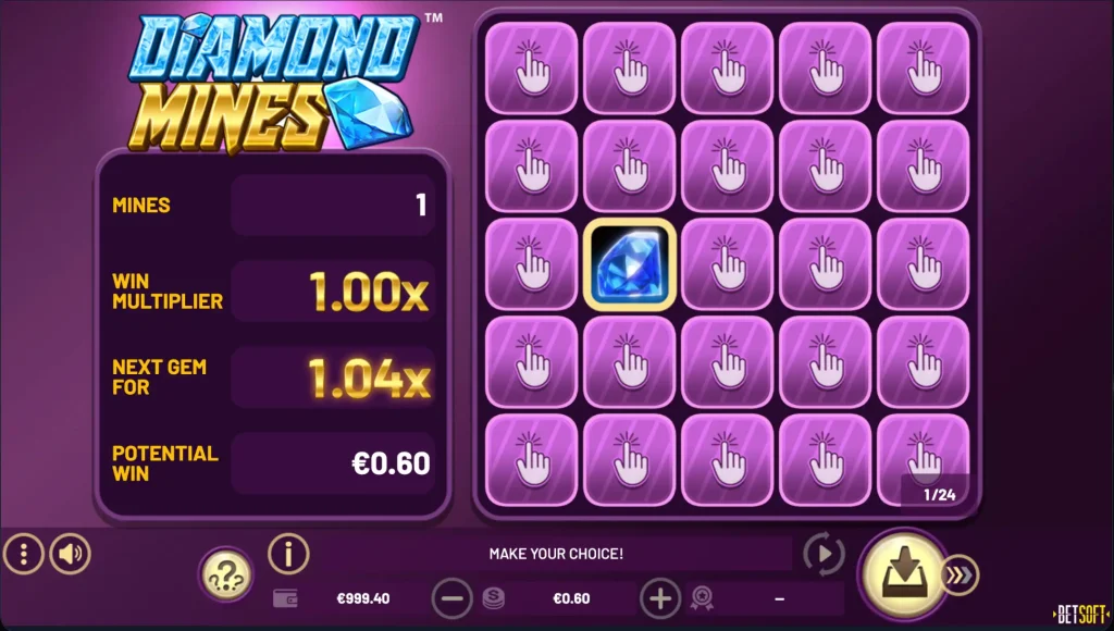 В Diamond Mines размер сетки не меняется — всегда 5×5. Это удобно: геометрия постоянна, а темп и риск вы регулируете не архитектурой поля, а количеством мин и моментом вывода. Никаких сюрпризов — всё прозрачно с первого раунда.