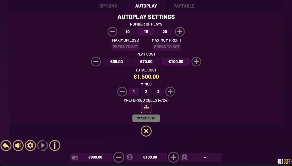 Сделайте паузу, оцените дистанцию и при необходимости скорректируйте ставку или количество мин. В игре доступен Autoplay: можно задать число раундов и стоп-условия по профиту/убытку — удобно, когда хотите играть на рельсах без лишних кликов.