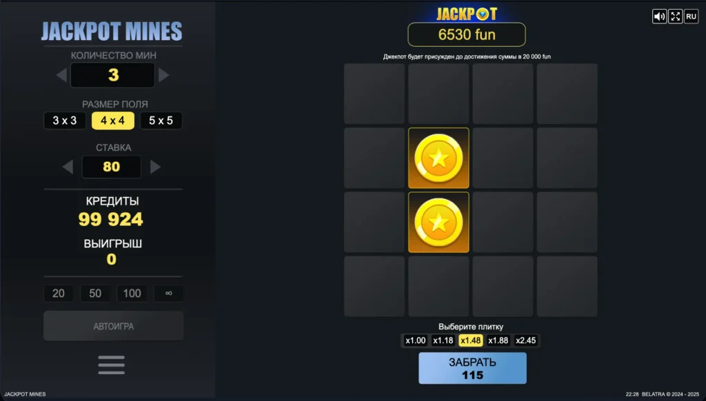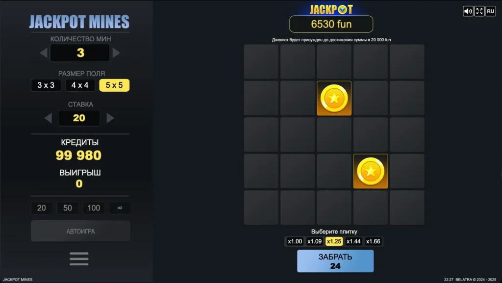 Обзор Jackpot Mines от Belatra Games — это казуальная минная аркада с классической логикой открытия клеток и прицелом на короткие мобильные сессии. Игра вышла 14 марта 2024 года: эту дату указывают официальные материалы Belatra и профильные издания. В пресс-релизах подчёркивается главная фишка — изменяемые размеры поля: 3×3, 4×4 или 5×5. Такой подход позволяет тонко настраивать темп: компактные сетки дают быстрые решения и ранние кэшауты, крупные — больше манёвра для осторожного набора множителя. Кроме того, варьируется количество мин на каждой сетке (до 6 на 3×3, до 12 на 4×4 и до 20 на 5×5), что напрямую влияет на риск и прирост выплаты за безопасный клик.