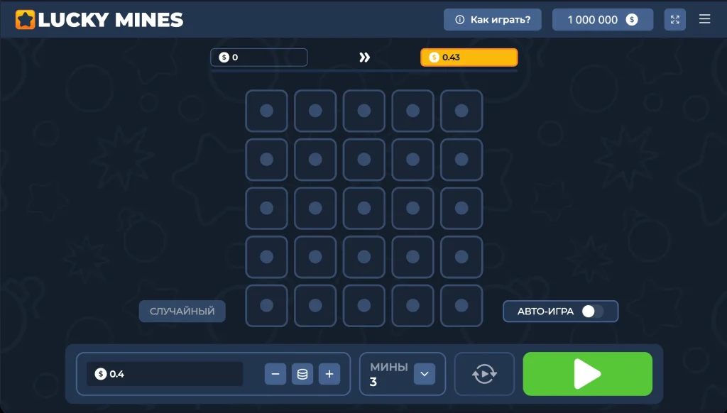 В Lucky Mines поле фиксировано — 5×5 (25 клеток). Менять геометрию не требуется и не предусмотрено: меньше отвлекающих настроек — больше фокуса на решение. Выберите, как играть: вручную (кликаете по клеткам «вживую») или в авто-режиме — отмечаете ячейки и правила, серия отрабатывается сама по заданному сценарию.