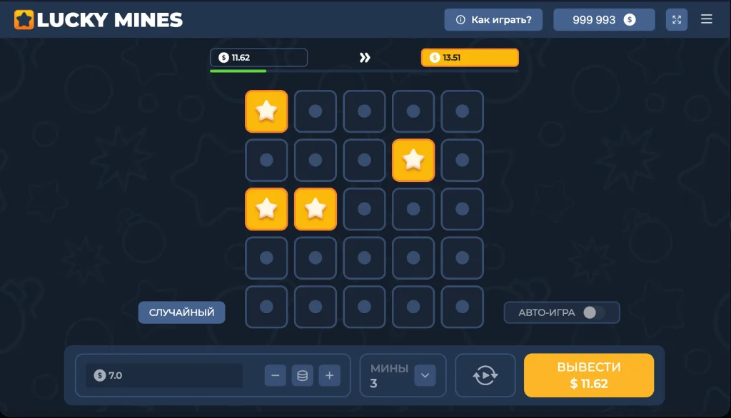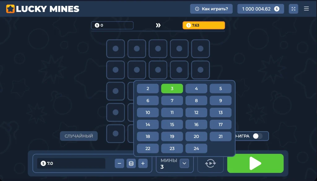 Главный ползунок риска — количество мин. Чем их больше, тем быстрее апается множитель и тем хардовее становится сессия. Для старта — умеренно: 2–4 мины, чтобы «вкатиться» без лишнего напряга. Хотите драйва — добавляйте перчинки, но держите голову холодной.