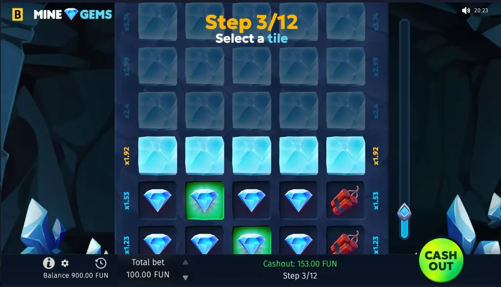 Определите цель заранее: до какого ряда идёте и при каком множителе фиксируете выигрыш. В Mine Gems мины на ряд зафиксированы — ключ в тайминге и дисциплине, а не в тюнинге поля. Начните консервативно — без фанатизма.