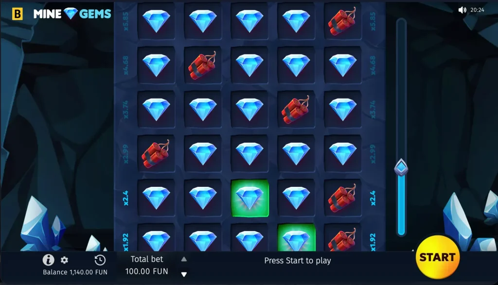 От конкурентов Mine Gems отличается своей геометрией и темпом: вместо классического квадратного поля со свободным кликом по всей сетке здесь прогресс идёт ряд за рядом. Это делает стратегию более дисциплинированной — игрок заранее планирует, как далеко готов зайти и в какой момент зафиксировать выигрыш. В официальных материалах акцент сделан на противопоставлении алмаз против динамита как базовой петле риска и награды: чем дальше вы продвигаетесь вглубь поля, тем выше становится вознаграждение и цена ошибки. Максимальные множители за одно прохождение в обзорах обычно указываются на уровне около ×14, что хорошо подчёркивает короткий, но напряжённый характер игры.