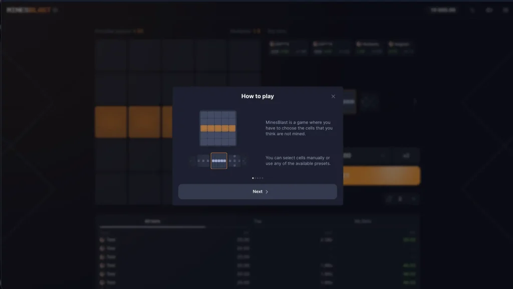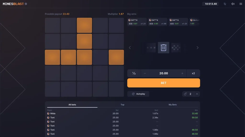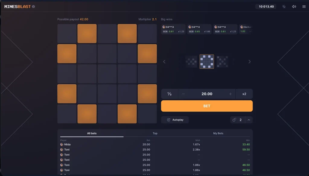Как работает геймплей. Поле всегда 5×5. Игрок задаёт количество мин и может пользоваться быстрыми шаблонами выбора клеток (pattern selection), что ускоряет ставки. Система рангов открывает новые элементы кастомизации за активную игру. Такой набор фич делает Mines Blast быстрой игрой: менять сложность легко, а входной порог минимальный. Можно ли менять игровое поле. Сам размер сетки не изменяется (всегда 5×5), поэтому вариативность достигается количеством мин и шаблонами выбора клеток. Это отличает игру от конкурентов с масштабируемой сеткой, но упрощает обучение и ускоряет принятие решений.
