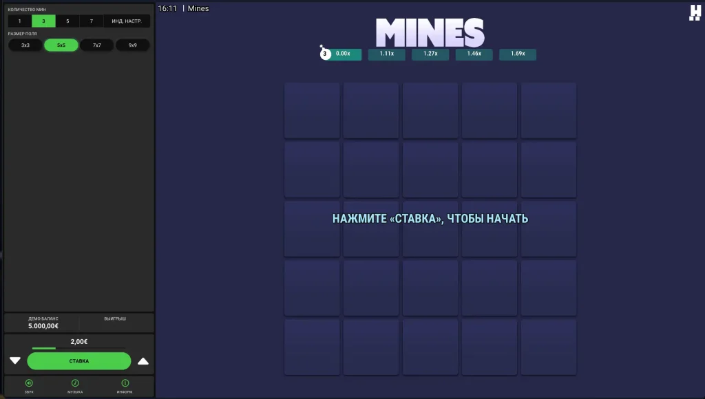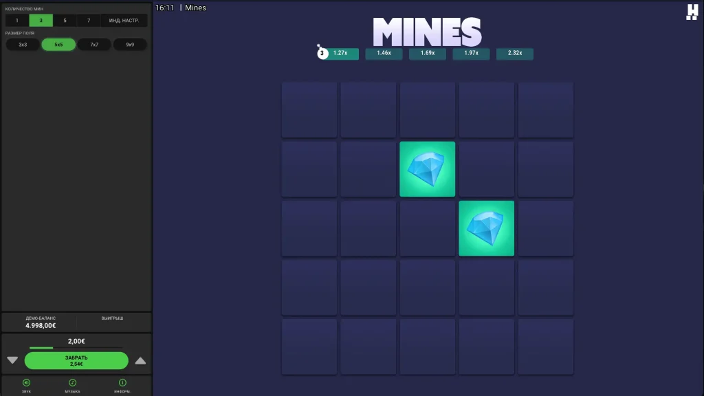 Задайте количество мин вручную: чем их больше, тем агрессивнее растёт множитель и тем выше риск промаха. Для знакомства начните с 2–3 мин на 5×5; для динамичной игры увеличивайте число мин или переходите на 7×7/9×9.