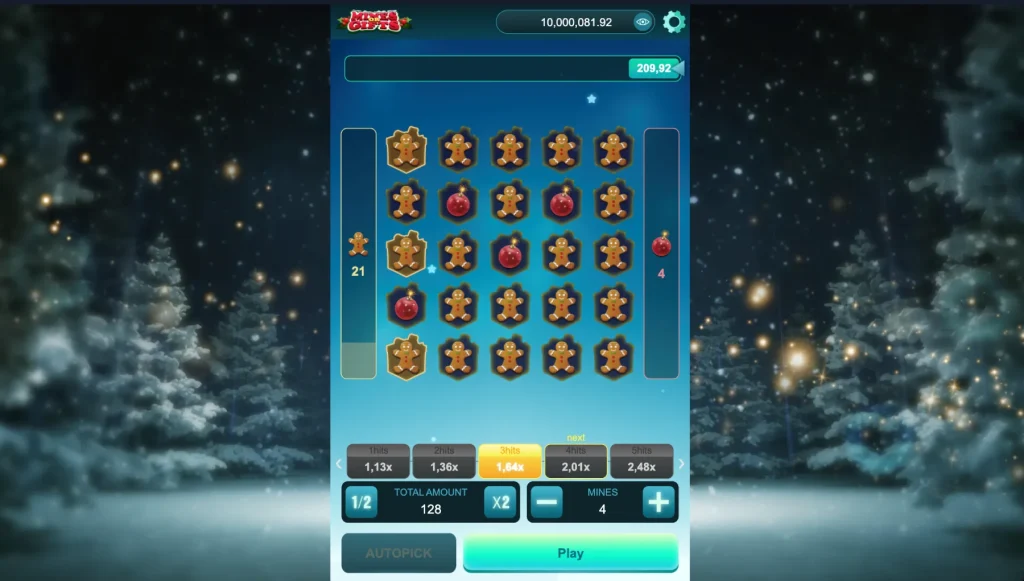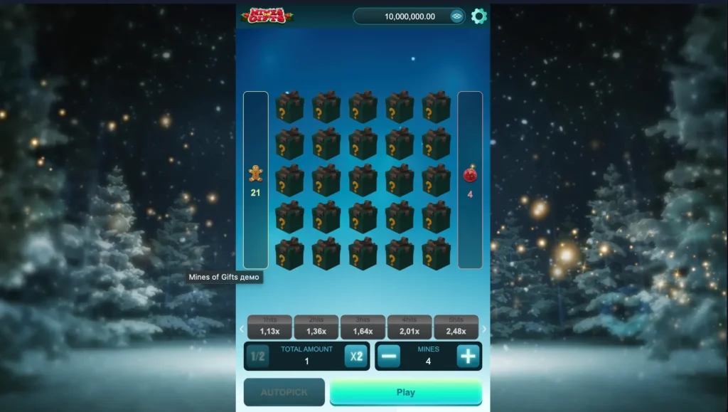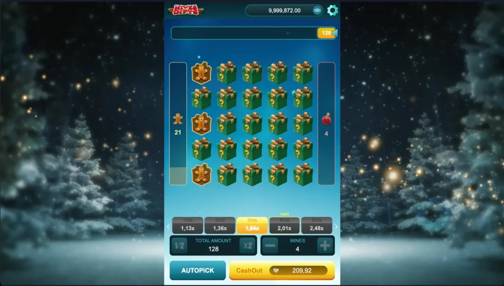 Открывайте клетки в любом порядке. Подарок — множитель растёт, мина — раунд завершается. Чем выше выставили число мин, тем ощутимее прирост за каждую безопасную клетку. Держите темп, не кликайте «на удачу» без плана.