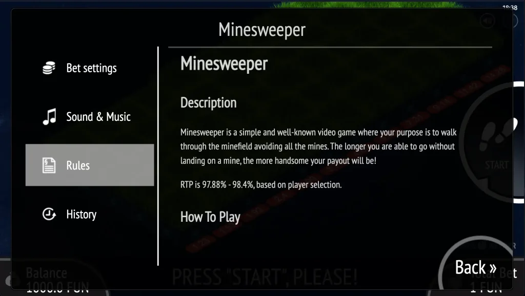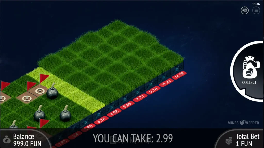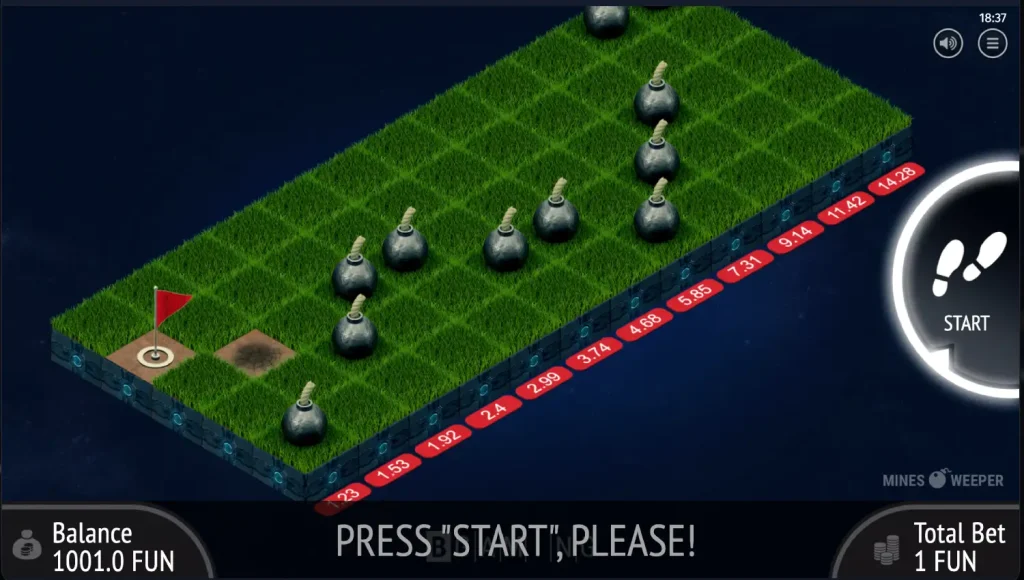 У BGaming у Minesweeper есть две ключевые версии. Оригинальная версия Minesweeper вышла 2 апреля 2016 года с RTP 98,4% — это классическая казуальная реализация движения к финишу, где вы шаг за шагом проходите поле и стараетесь не наткнуться на мину. Визуальные и звуковые эффекты усиливают напряжение (сочный boom, дым при неудаче), при этом интерфейс остаётся максимально простым.